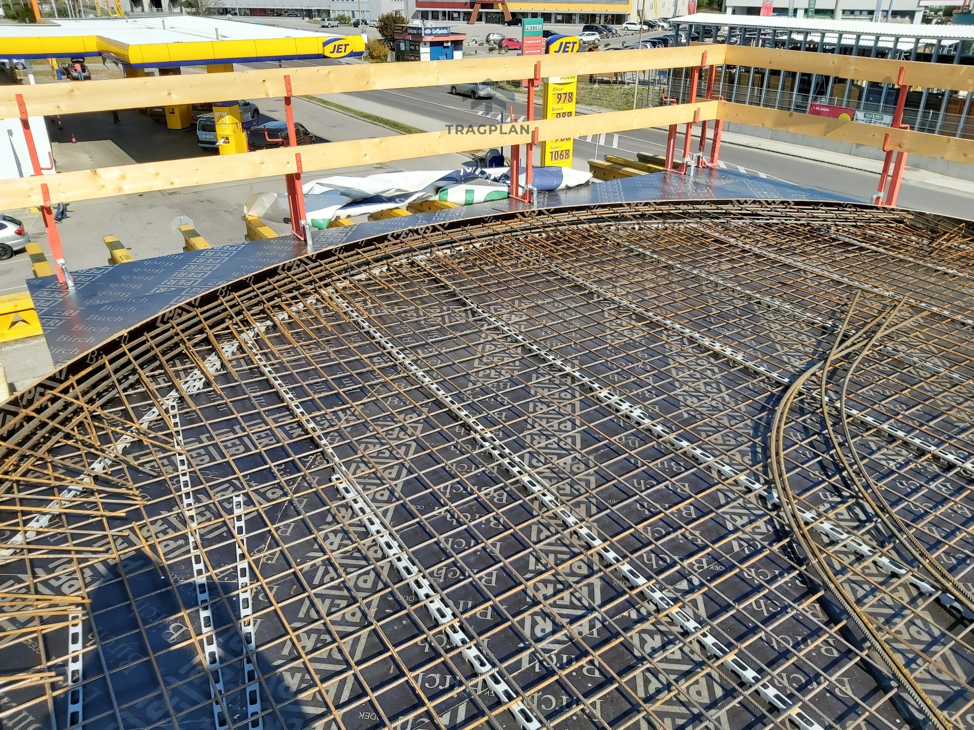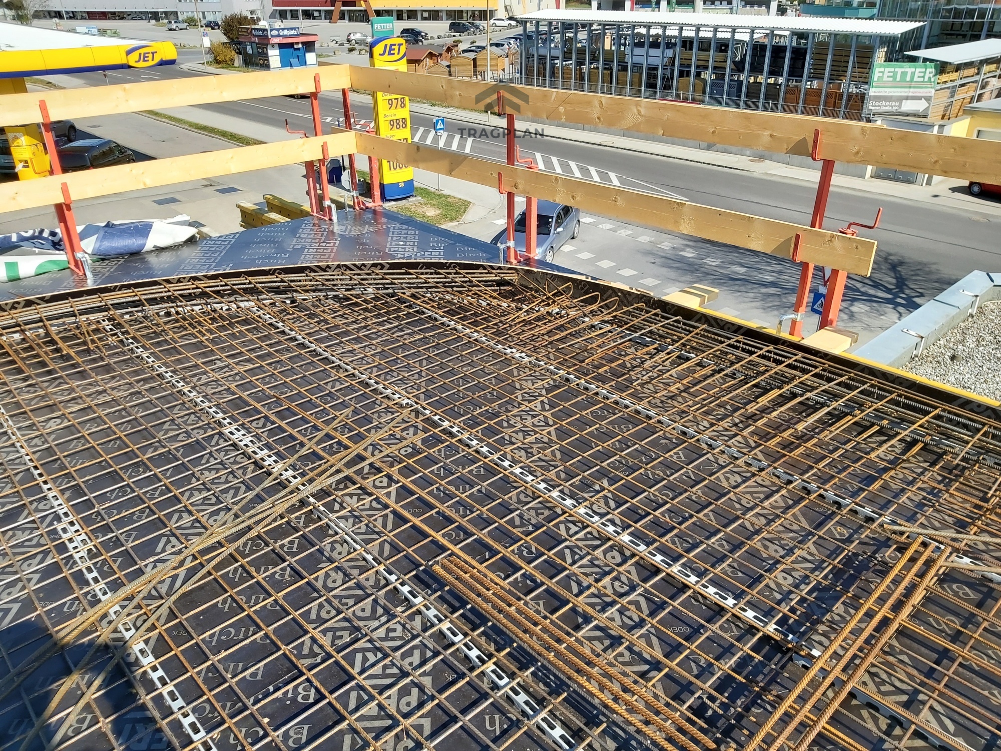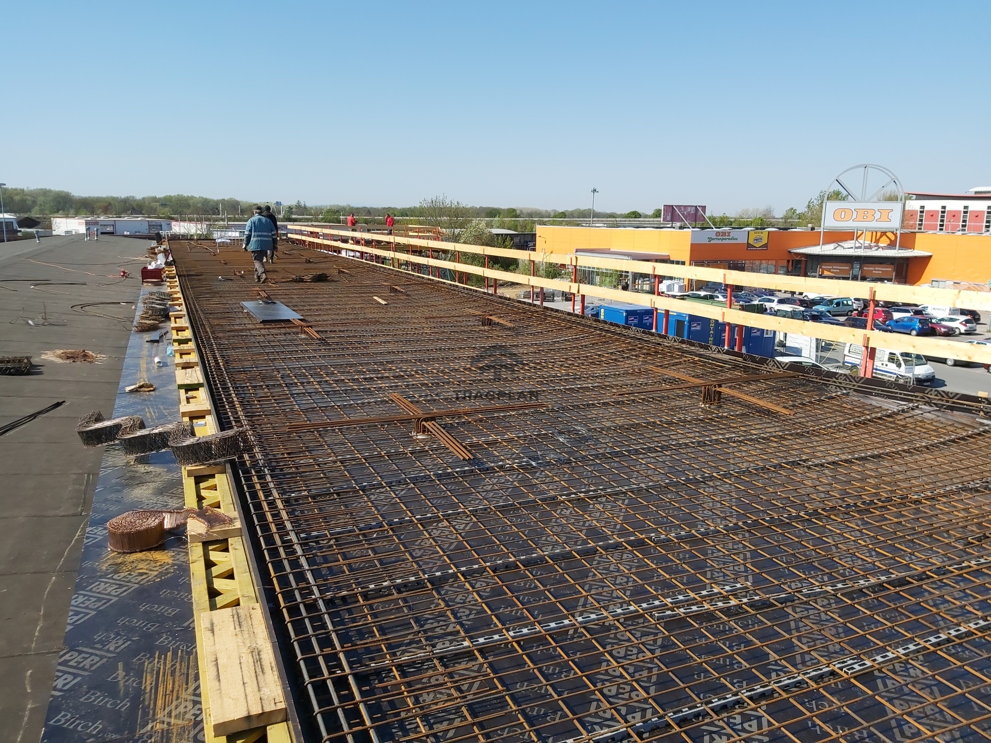 Das Tragwerk des Vordaches sowie des Umbaus desFachmarktzentrums besteht aus einer Kombination von Stahl- undStahlbetonkonstruktionen.