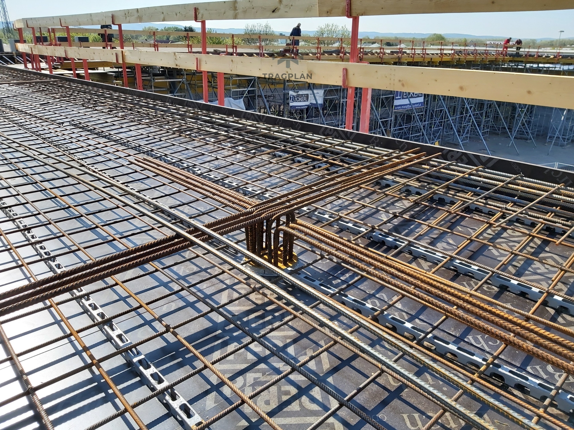 Die Lastabtragung erfolgt über Einzelfundamente aus Stahlbeton, welche dievertikalen Lasten aus den Stützen in den Baugrund ableiten.