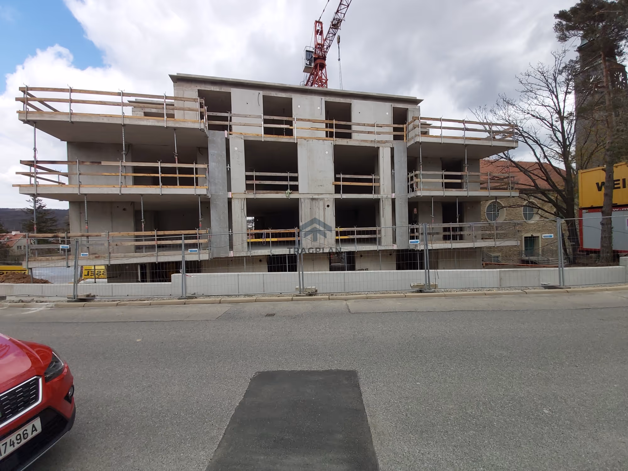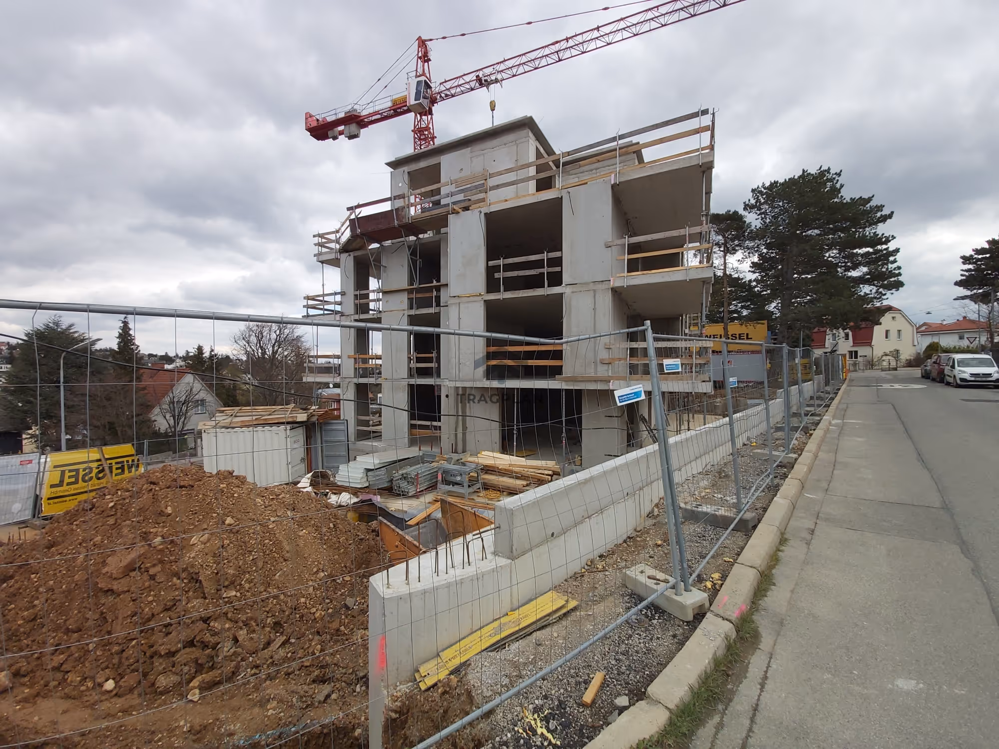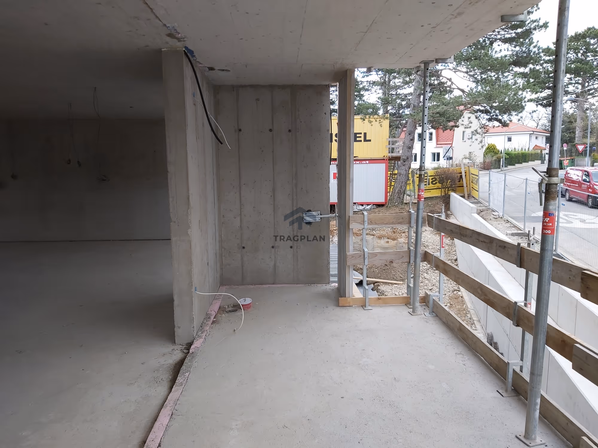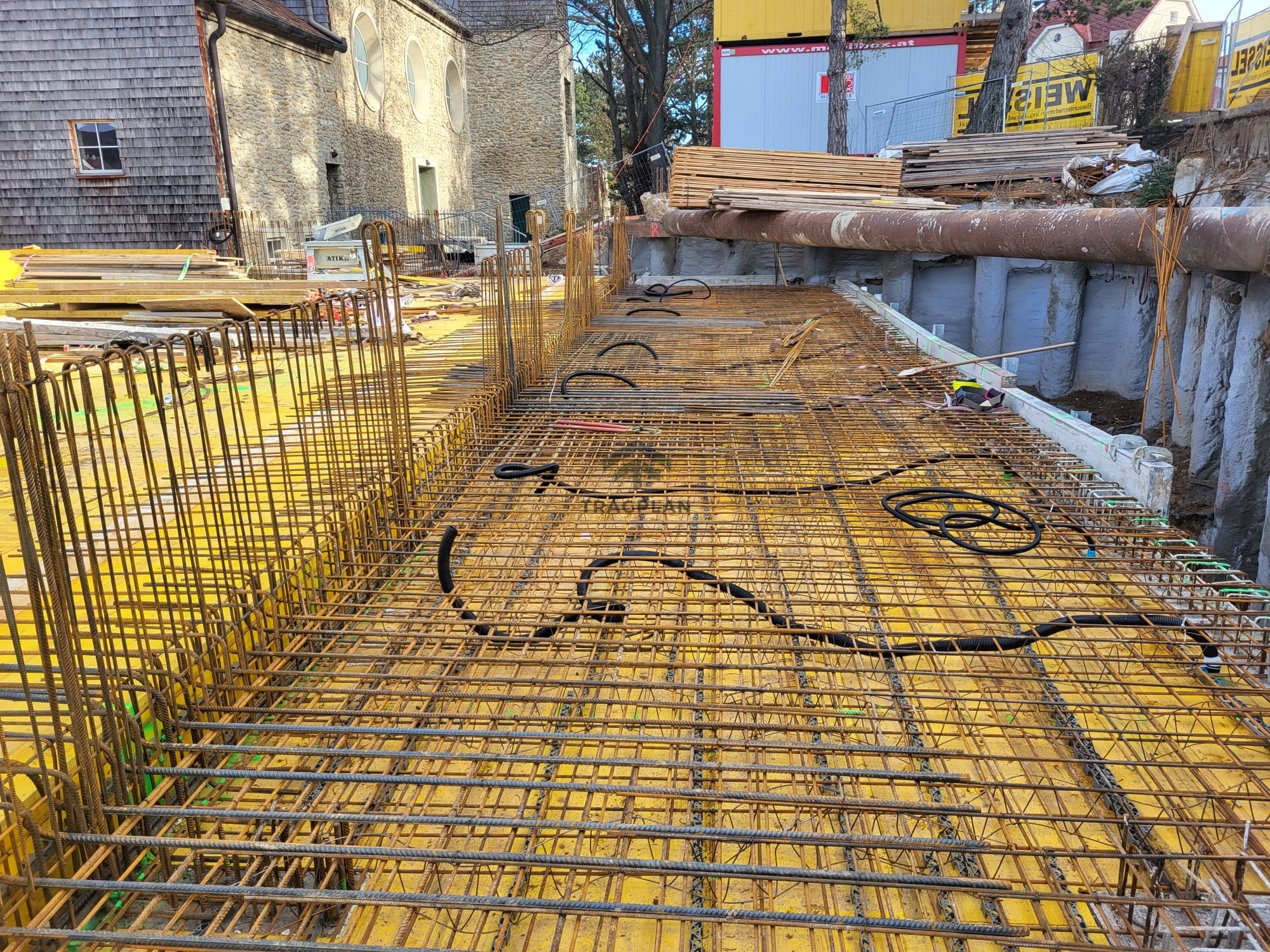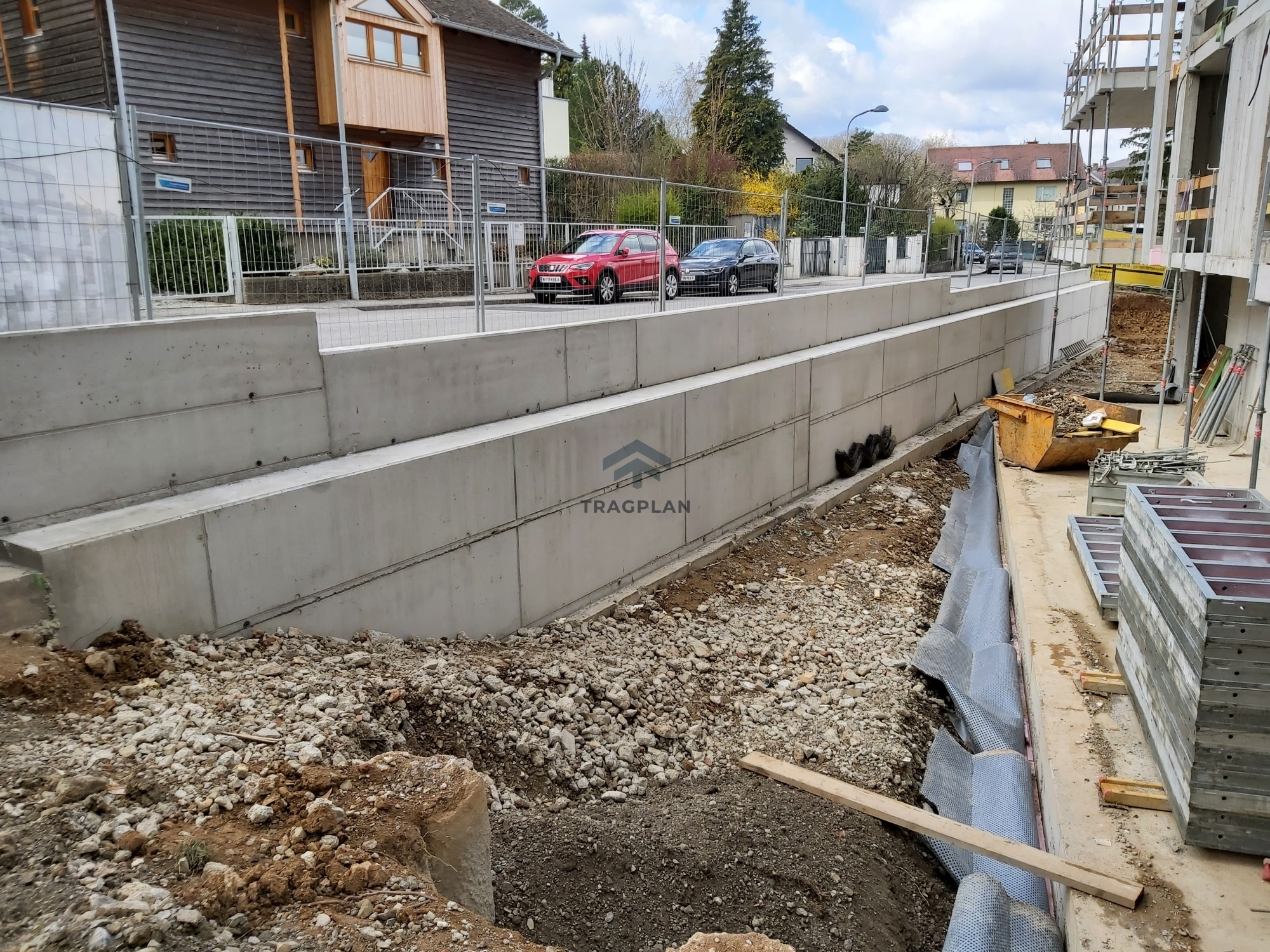 Die Baugrubensicherung erfolgt mittels aufgelöste Bohrpfahlwand mit einem Durchmesser von 52 cm mit Spritzbetonausfachung welche abschnittsweise hergestellt wurde. Zur Sicherstellung der Standsicherheitwährend der Bauphase wird die Bohrpfahlwand temporär durch horizontale Aussteifungselemente gesichert.