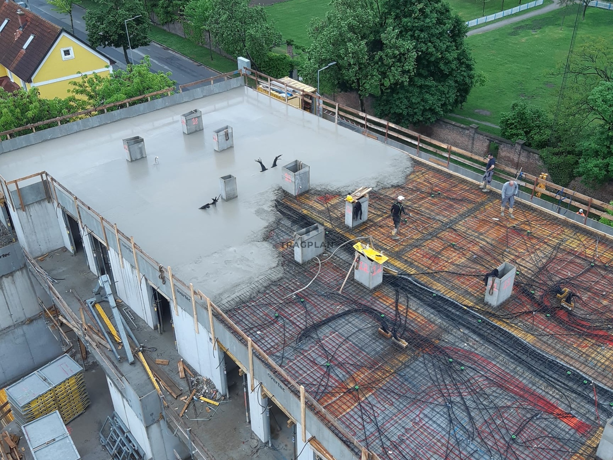 werden als Stahlbetondecken ausgeführt. Sie übertragen die Lasten auf die tragenden Wände und bilden zusammen mit diesen ein steifes Tragwerksystem, das sowohl vertikale als auch horizontale Lasten abtragen kann.