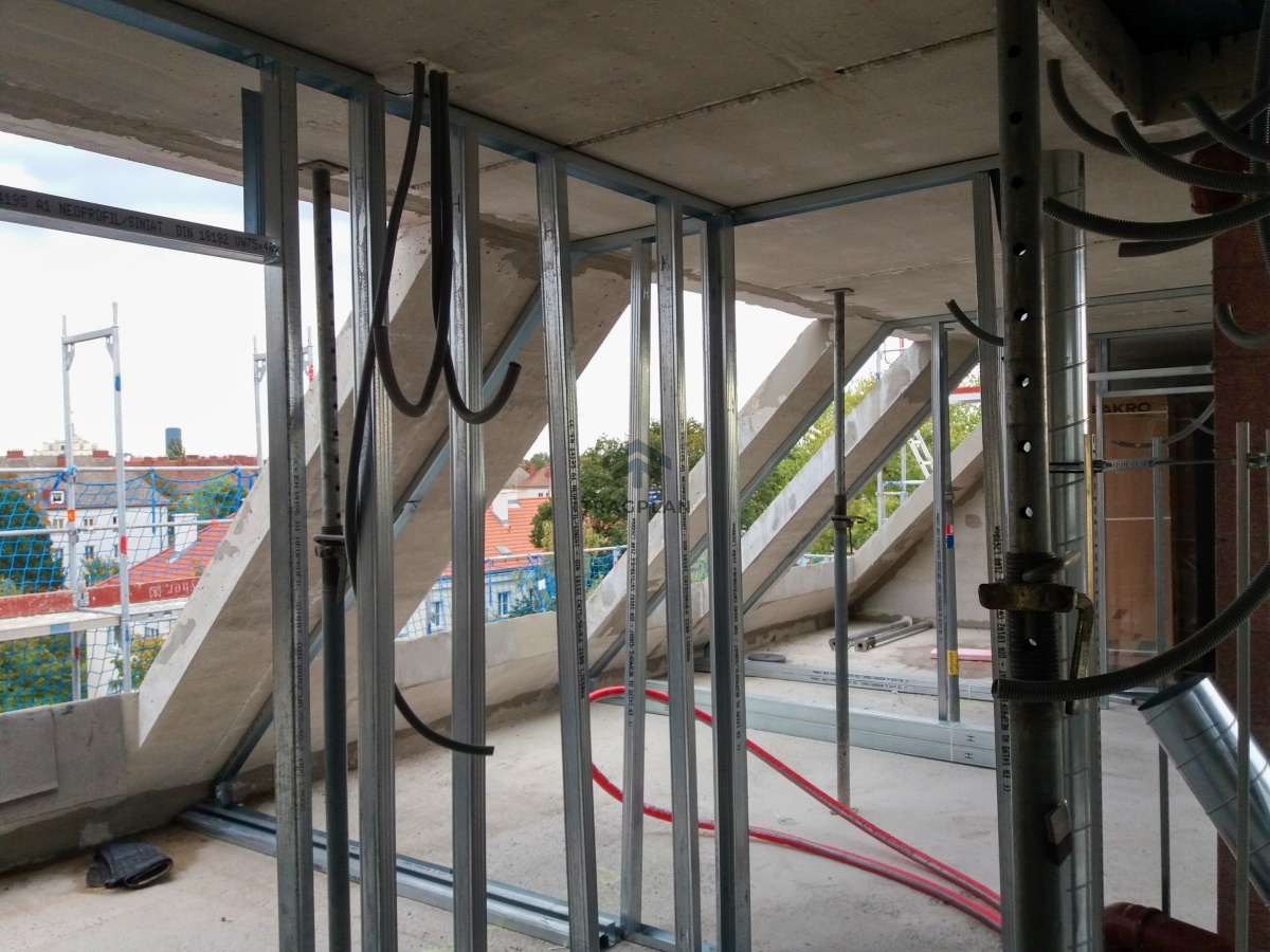wurden überwiegend als Ortbeton-Stahlbetonwände ausgeführt. Abdem Erdgeschoss wurden Hohlwände verwendet, um die Bauzeit und die Kosten zuoptimieren, wo dies statisch und konstruktiv möglich war.