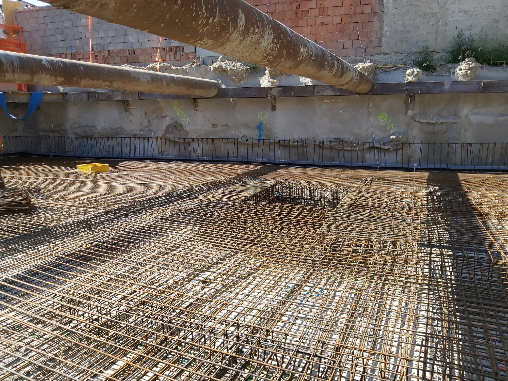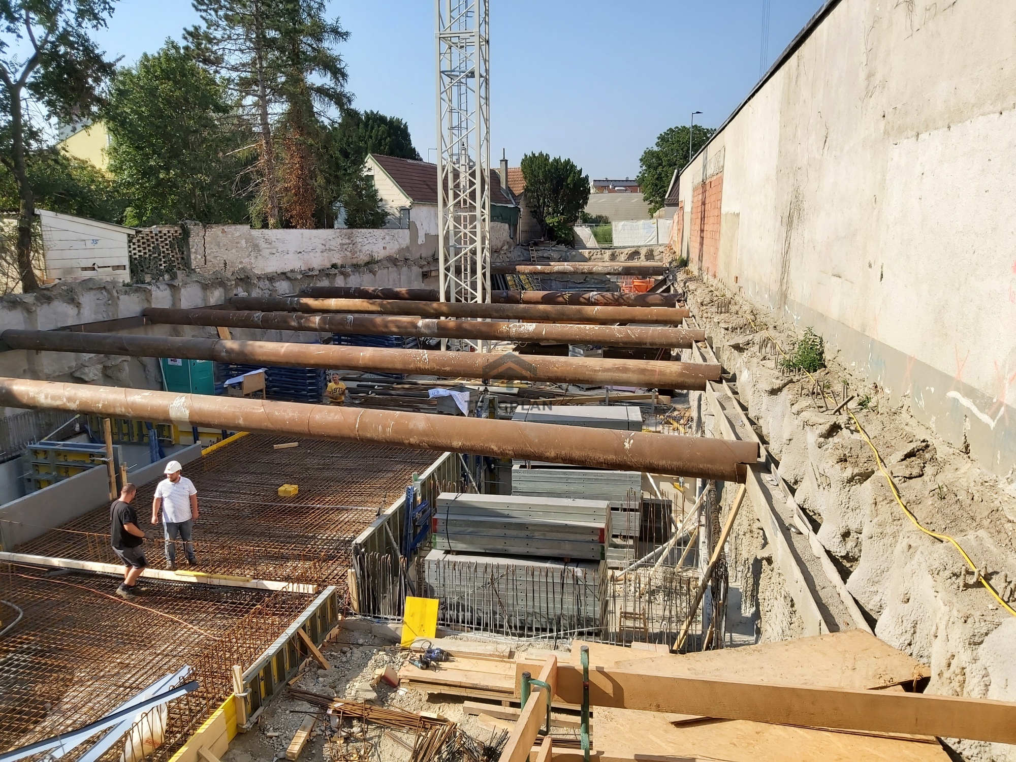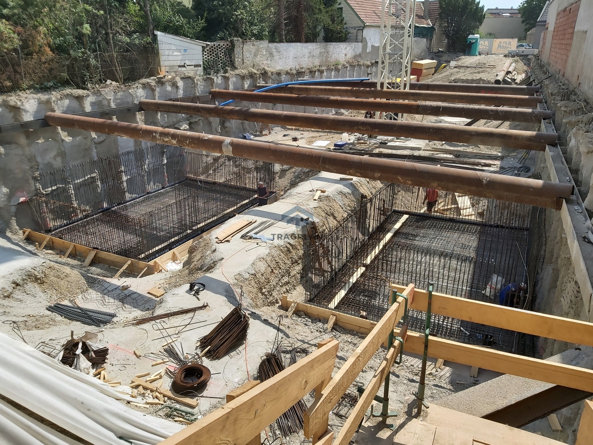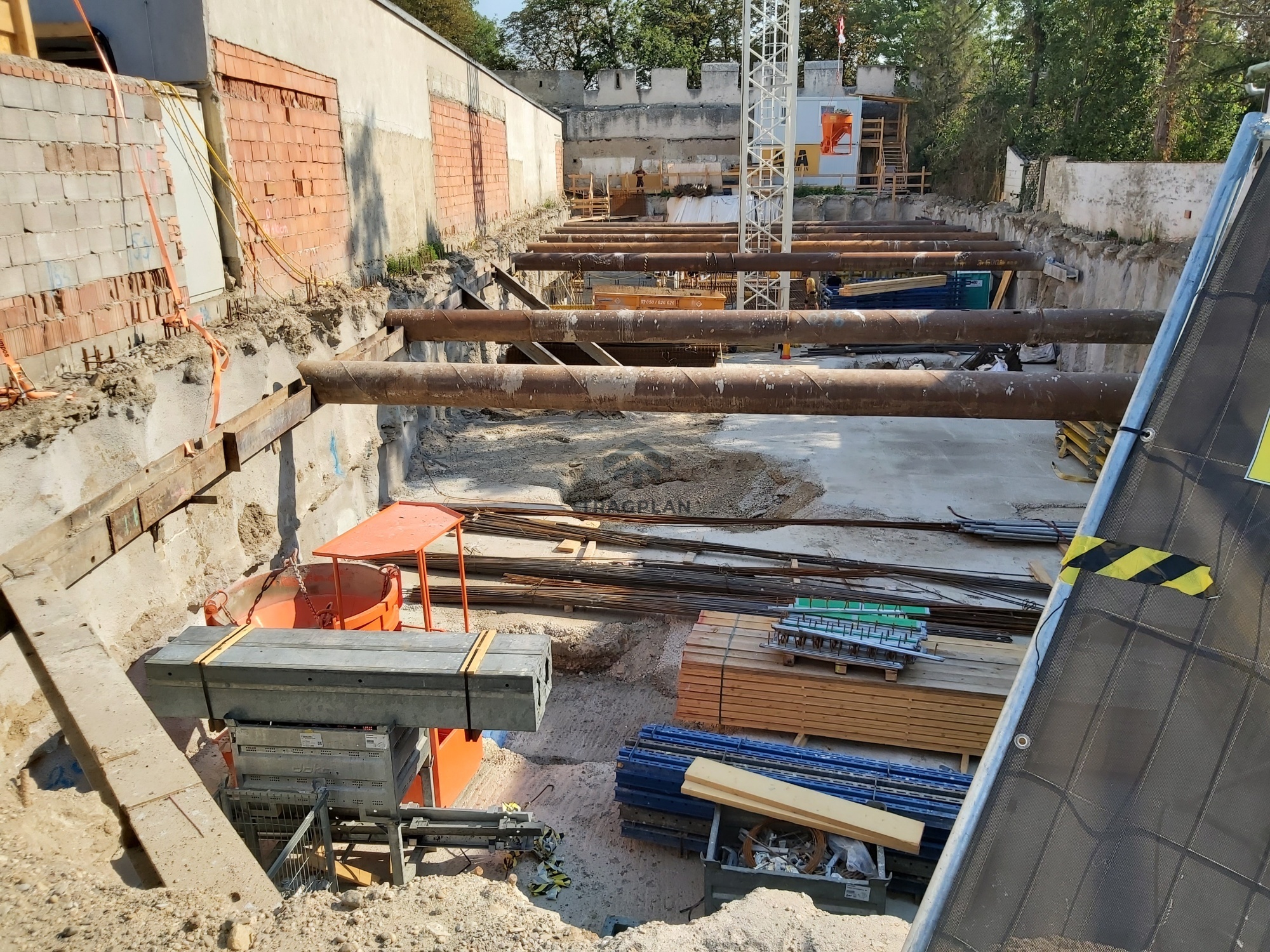 Die Baugrubensicherung erfolgte mittels einer aufgelöstenBohrpfahlwand mit Bohrpfählen DM 42 cm. Die Pfähle wurden in einem definiertenAbstand zueinander gesetzt und im Bereich der Doppelparker mit einerAussteifung versehen. Diese Konstruktion gewährleistete die Stabilität derBaugrube während der Aushub- und Bauphase.