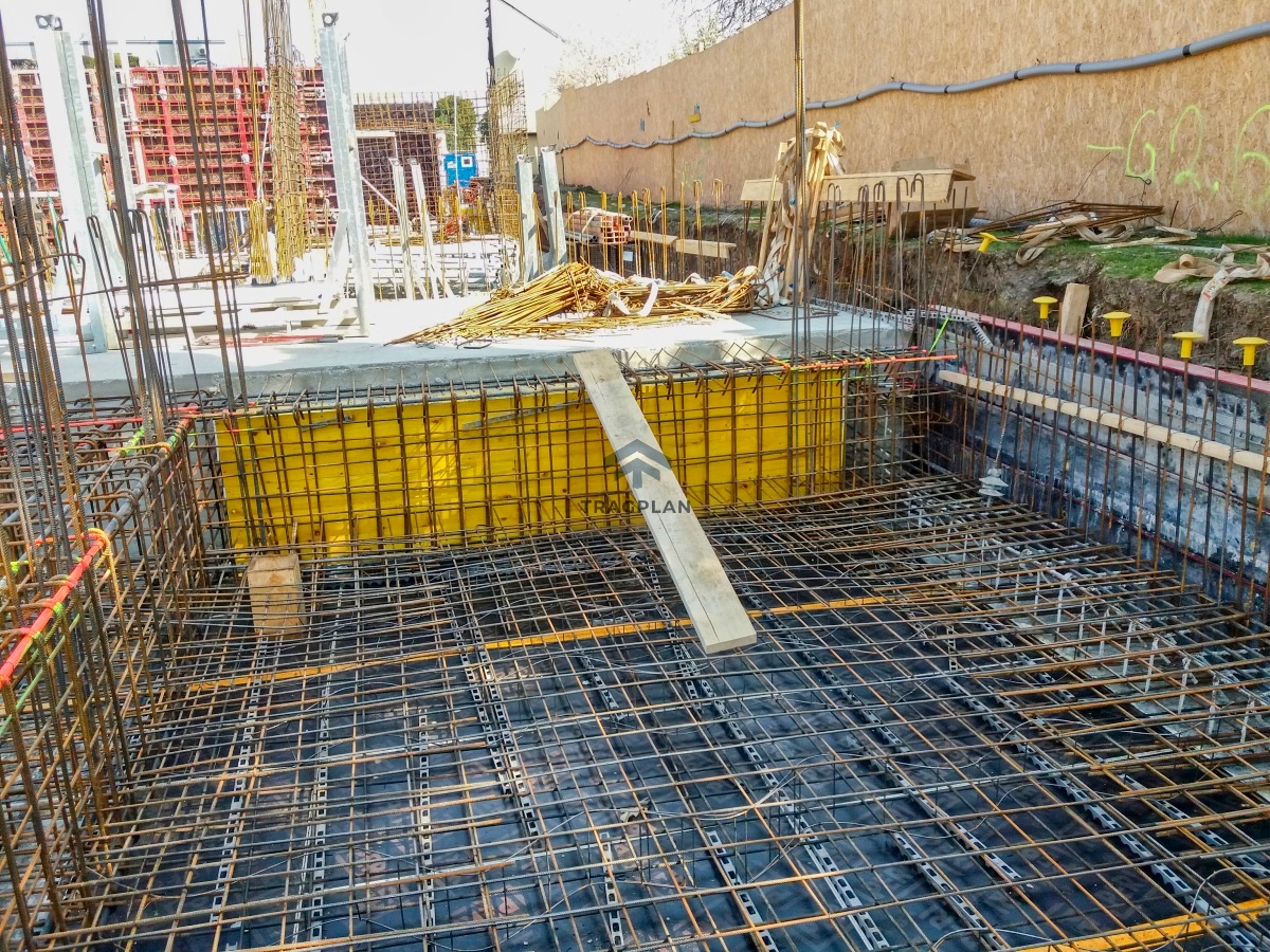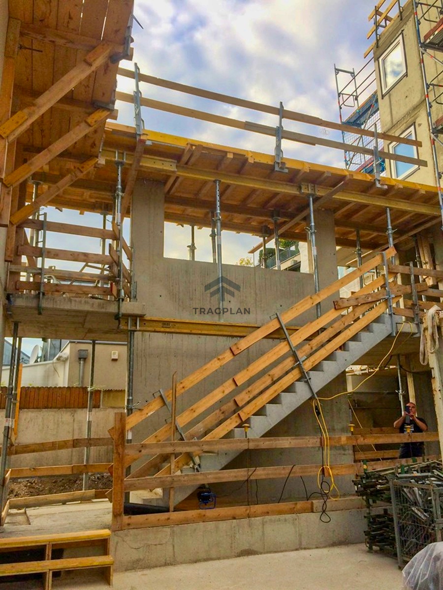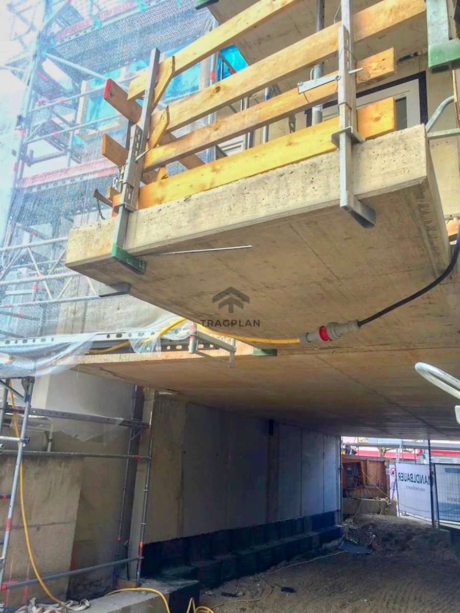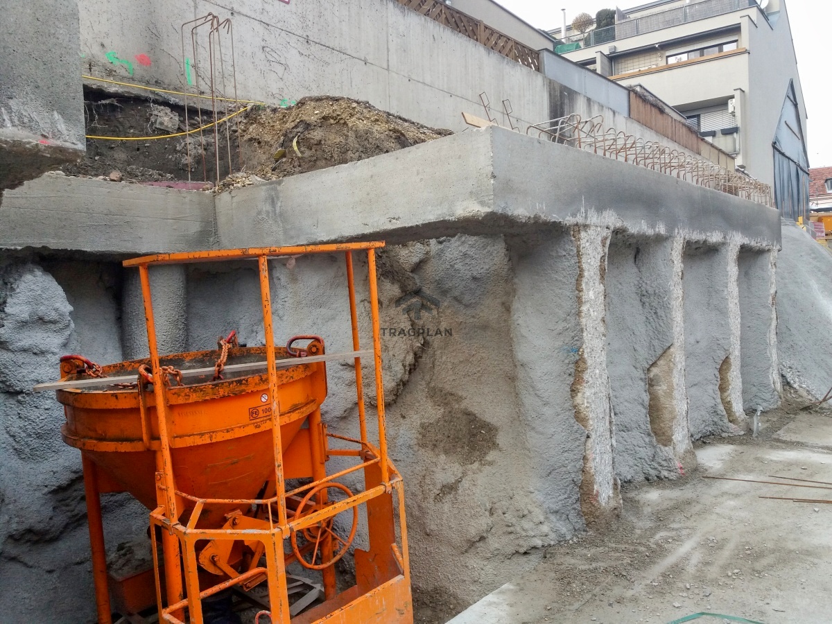 Die Baugrubensicherung erfolgte durch eine aufgelöste Bohrpfahlwand mit einem Pfahldurchmesser von 52 cm und Spritzbetonausfachung. Die Herstellung erfolgte abschnittsweise, um eine standsichere Baugrubenumschließung sowie die Arbeitssicherheit während der Fundament- und Kellerarbeiten sicherzustellen.